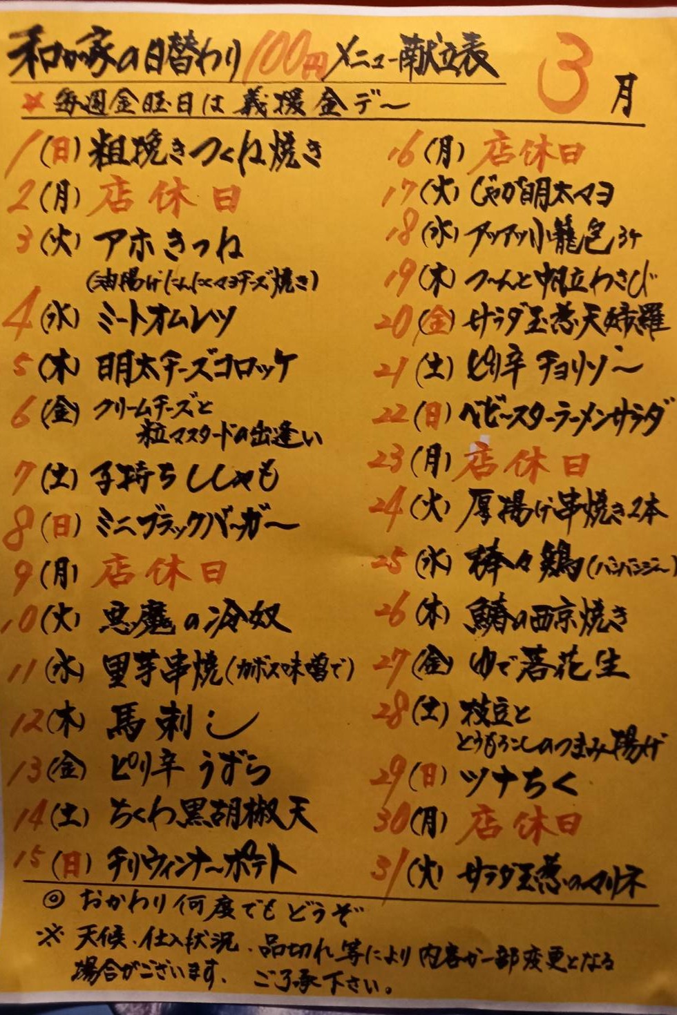 【2026年3月の100円メニュー】★毎週金曜日は義援デー